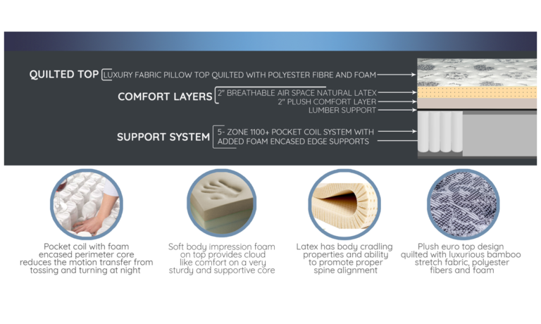 - Support system : 5- Zone pocket coil core with 4″ foam encased contouring for lateral support